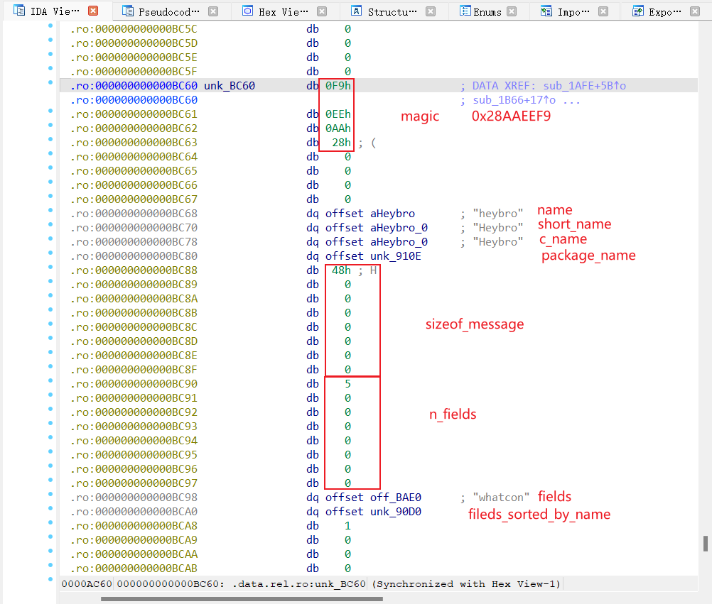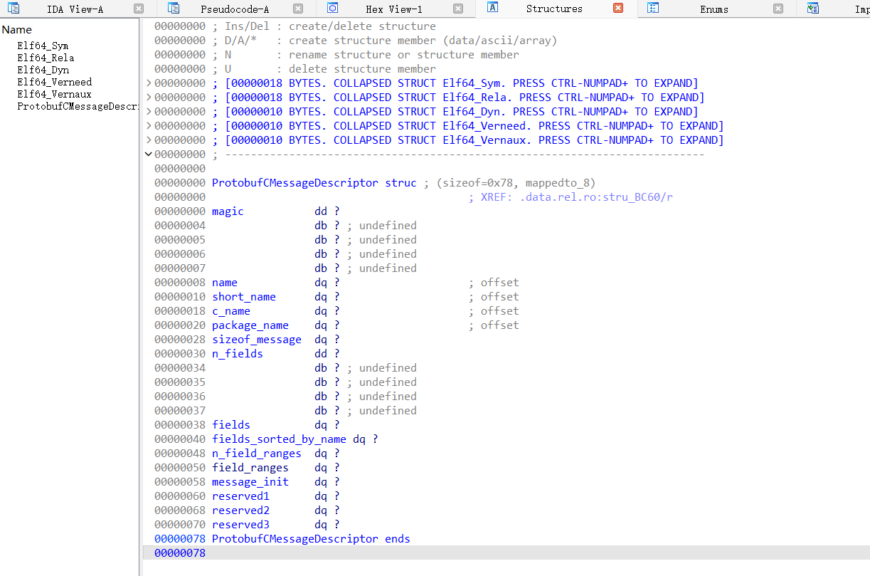 structProtobufCFieldDescriptor { /** Name of the field as given in the .proto file. */ constchar *name; /** Tag value of the field as given in the .proto file. */ uint32_t id; /** Whether the field is `REQUIRED`, `OPTIONAL`, or `REPEATED`. */ ProtobufCLabel label; /** The type of the field. */ ProtobufCType type; /** * The offset in bytes of the message's C structure's quantifier field * (the `has_MEMBER` field for optional members or the `n_MEMBER` field * for repeated members or the case enum for oneofs). */ unsigned quantifier_offset; /** * The offset in bytes into the message's C structure for the member * itself. */ unsigned offset; /** * A type-specific descriptor. * * If `type` is `PROTOBUF_C_TYPE_ENUM`, then `descriptor` points to the * corresponding `ProtobufCEnumDescriptor`. * * If `type` is `PROTOBUF_C_TYPE_MESSAGE`, then `descriptor` points to * the corresponding `ProtobufCMessageDescriptor`. * * Otherwise this field is NULL. */ constvoid *descriptor; /* for MESSAGE and ENUM types */ /** The default value for this field, if defined. May be NULL. */ constvoid *default_value; /** * A flag word. Zero or more of the bits defined in the * `ProtobufCFieldFlag` enum may be set. */ uint32_t flags; /** Reserved for future use. */ unsigned reserved_flags; /** Reserved for future use. */ void *reserved2; /** Reserved for future use. */ void *reserved3; };